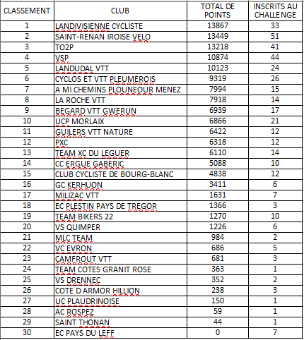 Le principe de ce classement étant de comptabiliser, lors de chaque manche, les points du classement scratch (filles et garçons ensemble) des 3 premiers de chaque club dans les catégories pupilles, benjamins, minimes et cadets ainsi que ceux des 2 premiers dans la catégorie moustiques/poussins.