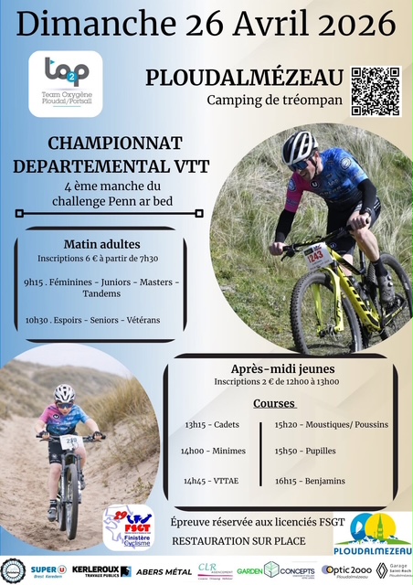 Le dimanche 26 avril, le to2p organisera une manche du challenge Penn Ar Bed VTT 2026 (jeunes et adultes), elle fera office du championnat départemental 29.