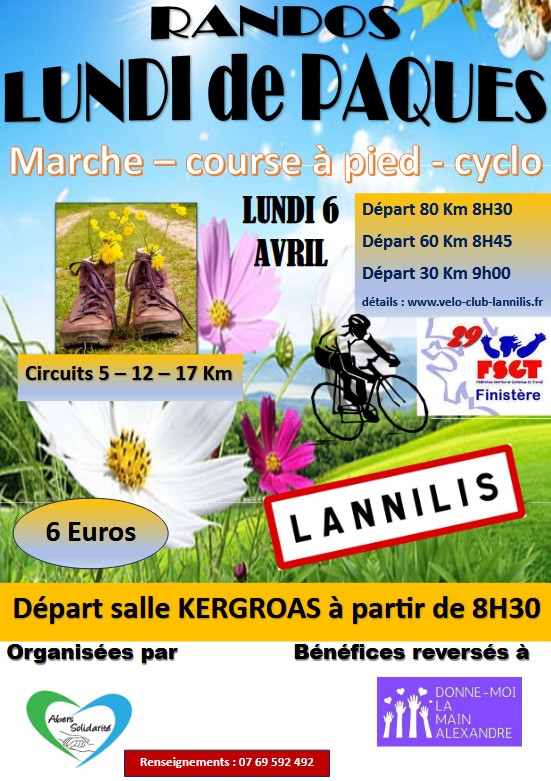 Abers solidarité, en collaboration avec le Vélo Club de Lannilis, organise sa traditionnelle journée de solidarité - le lundi 6 avril 2026. Les bénéfices seront reversés à l'association "Donne-moi la main Alexandre" https://www.facebook.com/donnemoilamainalexandre/ Voici les 3 parcours cyclos au départ de la salle Kergroas à Lannilis : 08h30 : 80 km, réf openrunner : https://www.openrunner.com/route-details/18353504 08h45 […]