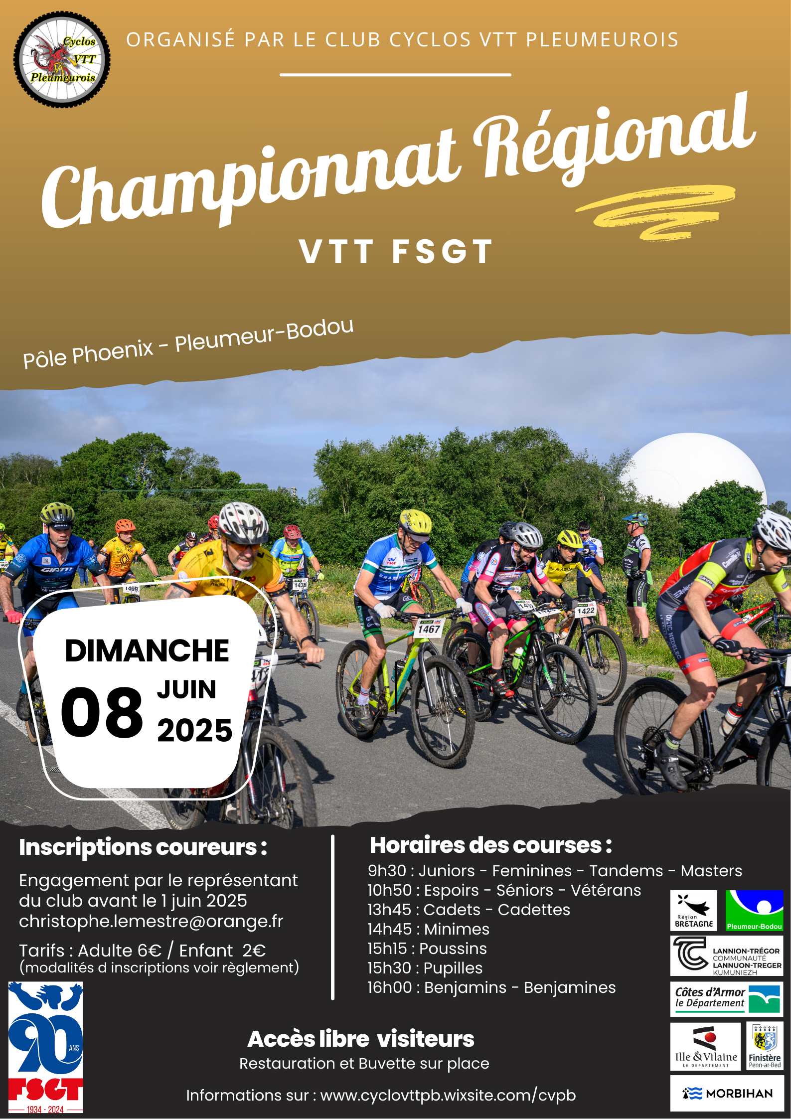 la 8ème manche du Challenge de la PAB VTT FSGT et Le championnat régional de VTT se dérouleront le dimanche 8 juin 2025 à Pleumeur Bodou, organisé par le Club Cyclos et VTT Pleumeurois.