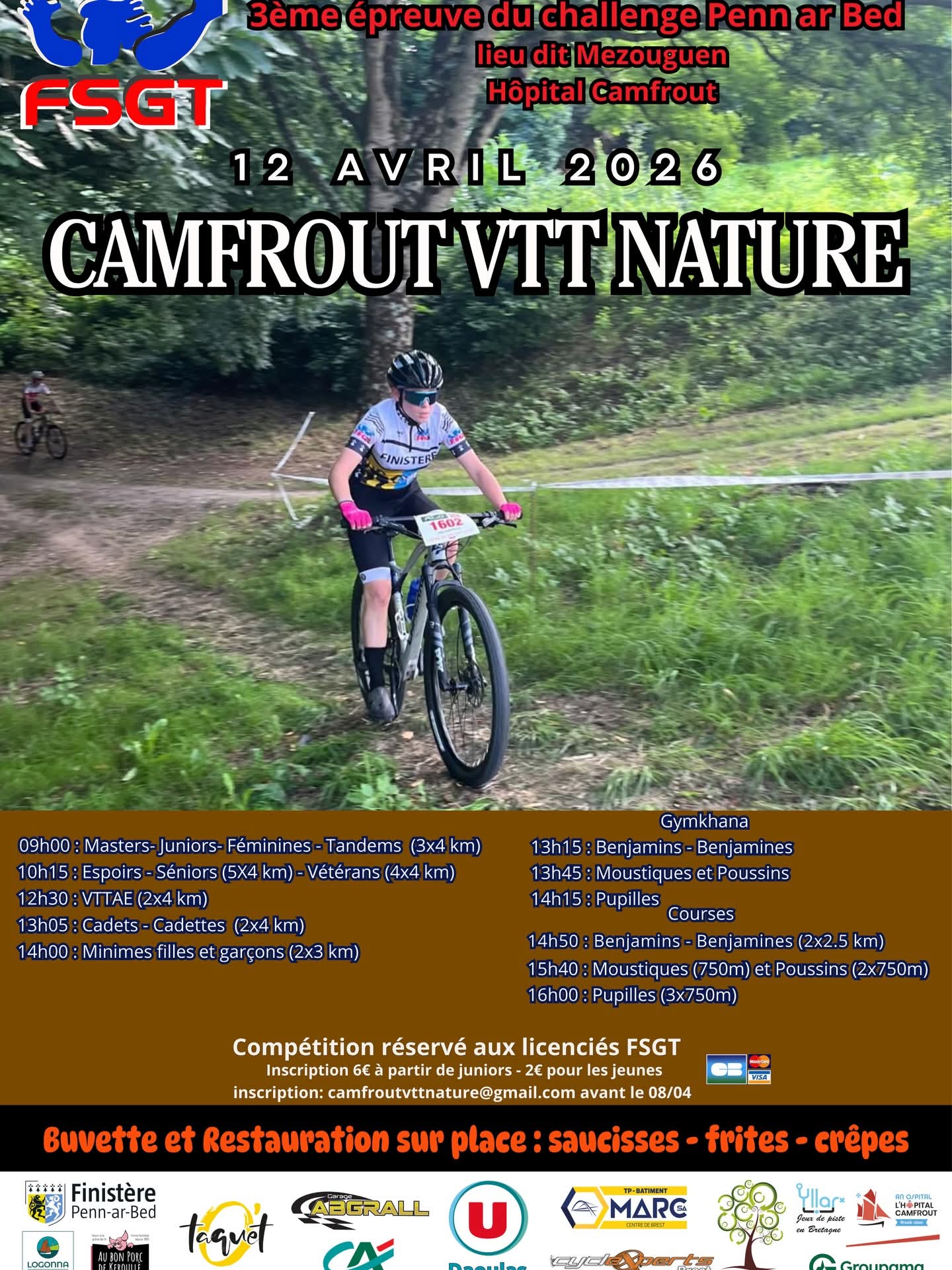 Compétition réservée aux licenciés FSGT Inscription : camfroutvttnature@gmail.com avant le 05/04/2026 buvette et restauration sur place : saucisses, frites et crêpes